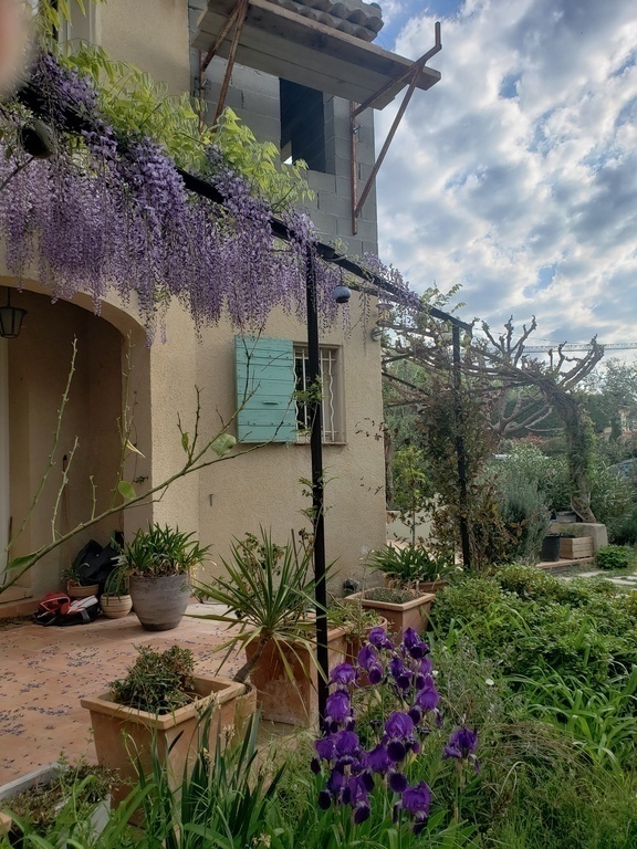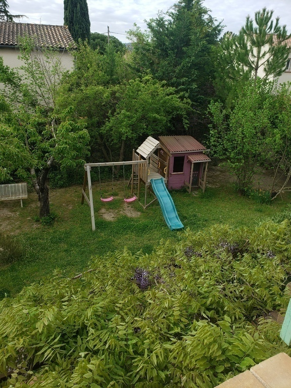 Notre jardin est entièrement clos et arboré : oliviers, figuiers, cerisiers, lauriers roses etc... Très agréable aux beaux jours! il y a aussi plusieurs terrasses, au rez de chaussée. Il y a un portique enfant avec balançoires, toboggan et une petite maison en bois.