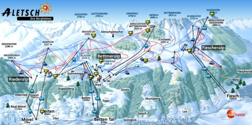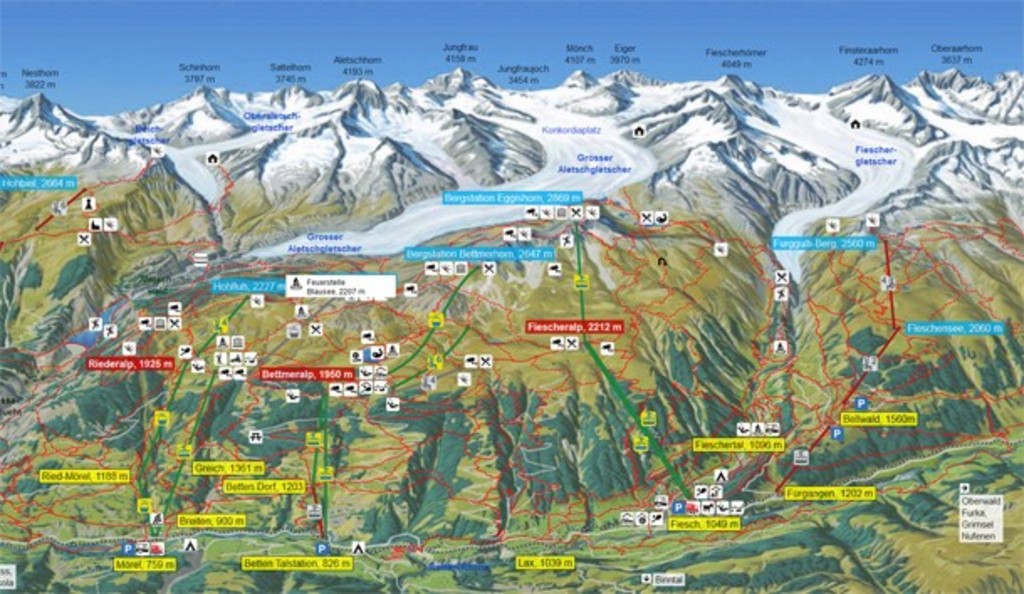 Neben unserem Haus befindet sich die Station der 6 Personen Kabinenbahn. Das Dorf Ried-Mörel ist die Mittelstation. Darum hat es auch nicht viele Leute, die hier in Ried-Mörel mit der Kabinenbahn fahren. Die Seilbahn bringt Sie in ein paar Minuten auf 2000m zur Riederalp. Verschiedene Bahnen bringen Sie von hier noch höher hinauf. Die Aussicht auf den Aletschgletscher, den grössten Gletscher der Alpen ist beeindruckend. In jeder Jahreszeit gibt es vielfältige Möglichkeiten. Wanderwege, Klettermöglichkeiten, Golf, Kletterpark, grosses Skigebiet im Winter.