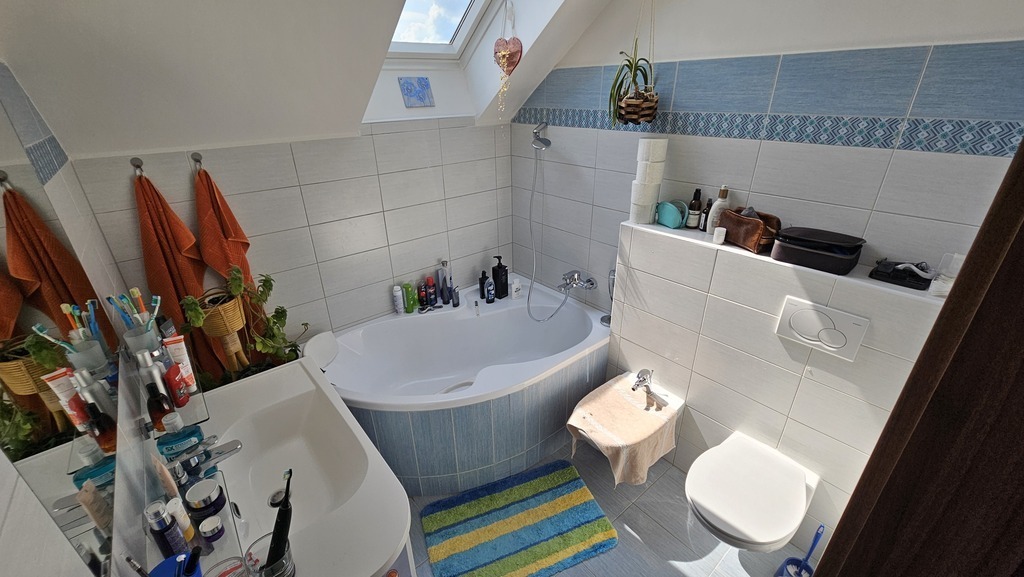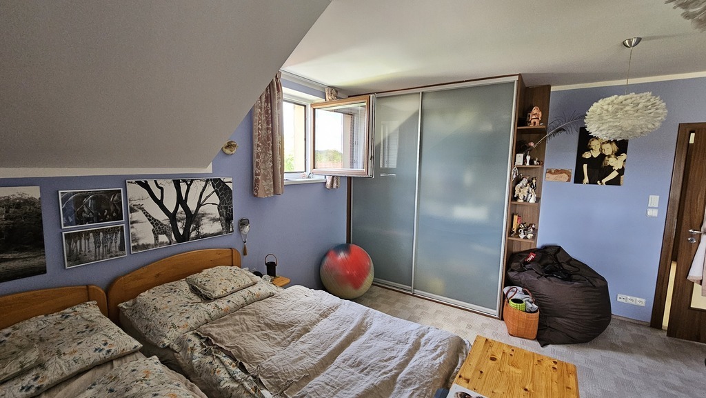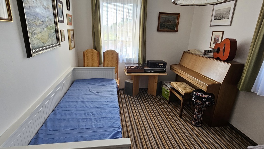 Our house has a living room with a fireplace, a kitchen with a dishwasher, a bathroom with WC and shower, a small room with a washer and dryer and a 2-beds-bedroom in the ground floor. There are three 2-beds-bedrooms, two bathrooms, each with WC and a bath, and a small library in the first floor. We have three TVs and a Kinect console, we can play table tennis or do a work-out in the cellar.