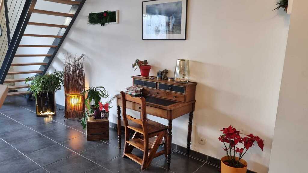 La chambre des parents se trouve côté jardin, possède un lit de 160 cm. Dans la salle de bain, il y a une grande douche et une baignoire.