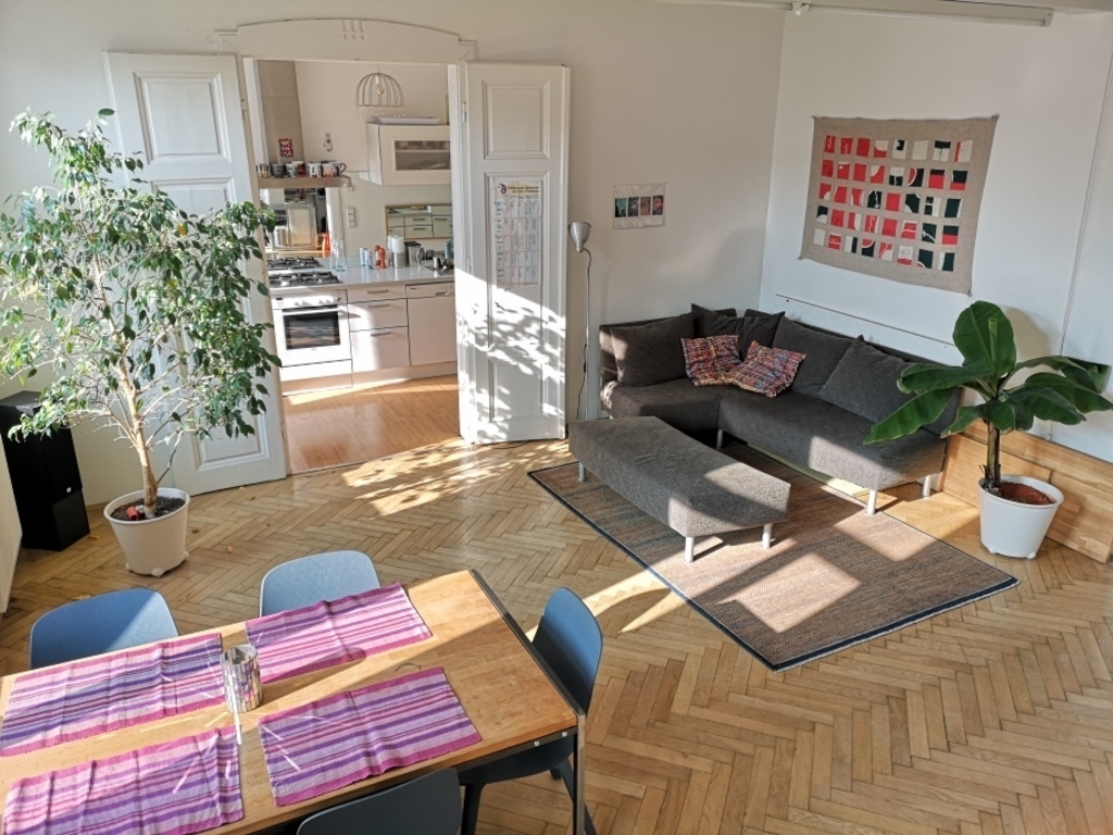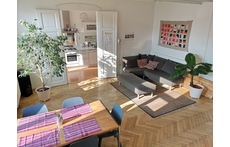 The apartment is situated in the 3rd floor of a typical turn of the century - building with view over a little park. The rooms are high, bright and spacious. It is 120 square meters lange and consists of three spacious rooms: a large living room, two bedrooms (each 25 square meters), kitchen, bathroom with shower and bathtub and two toilets. One bedroom is furnished with a double bed, the second with a single bed and a sofa bed for 2 people. In the living room, the coach can also be converted into a cozy place to sleep.