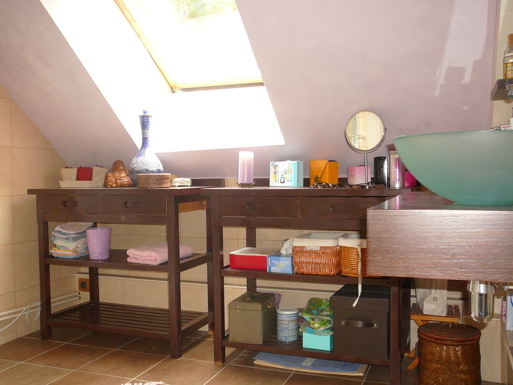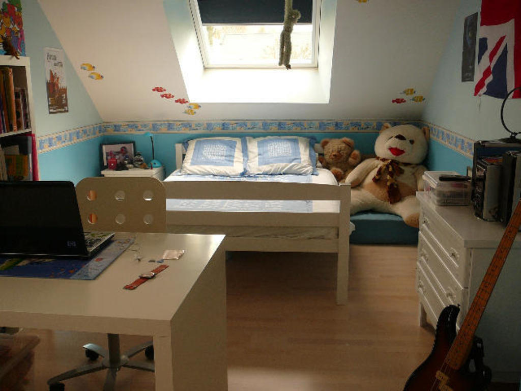 A l’étage : 3 chambres (3 avec lit double), 1wc, 1 salle de bain avec douche et un bureau (avec instruments de musique dont un piano numérique). Le grenier peut aussi être equipé en chambre.