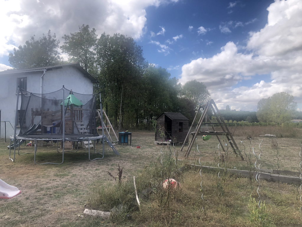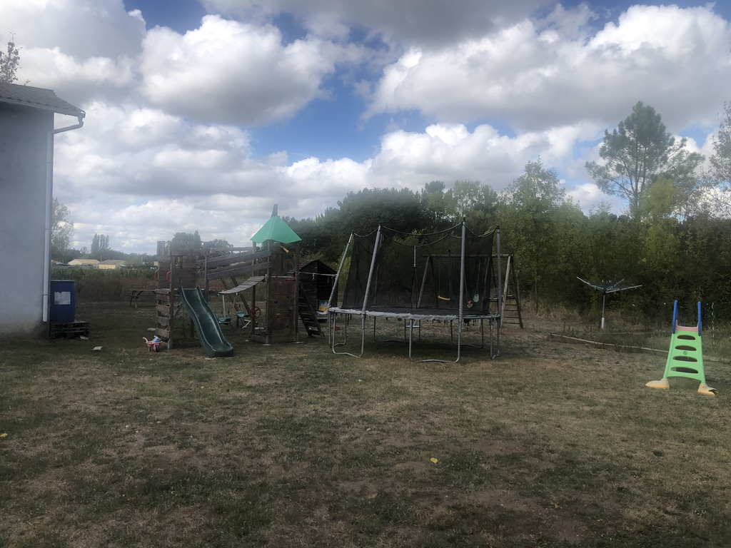 Dans le jardin il y a plusieurs structures de jeux : cabane, toboggan, cage de foot, des vélos et trottinettes.