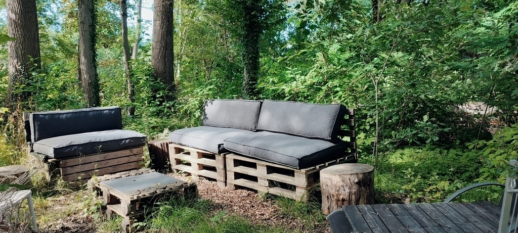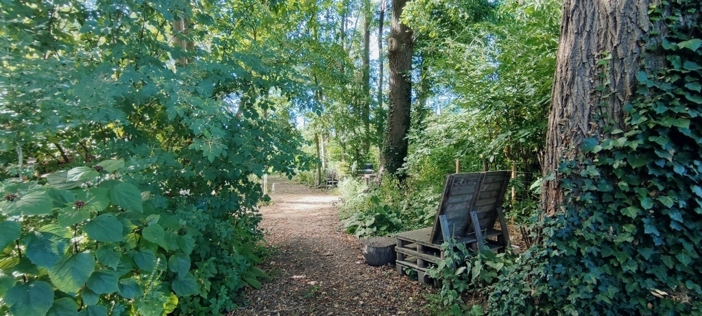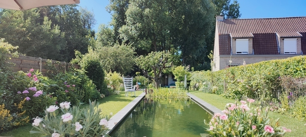 De tuin is 9m breed en 100m diep met een totale oppervlakte van 1840 m². We hebben een natuurlijke zwemvijver en voor de kinderen is er een trampoline en speelboom met schommel/trapeze/ klimtouw/... Het 2de deel van de tuin is een klein stukje natuur met lounge gedeelte en Bbq voorziening. We hebben ook 3 kippen.