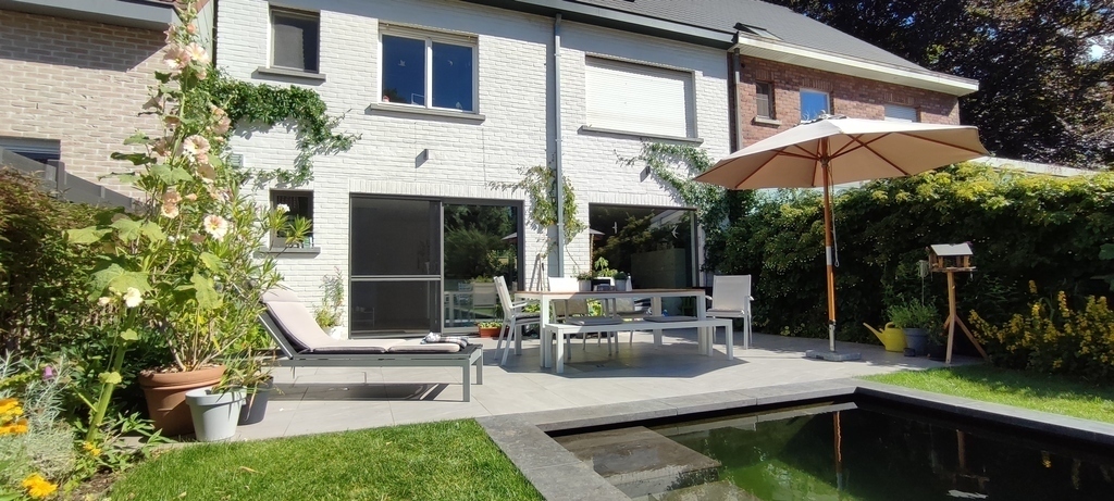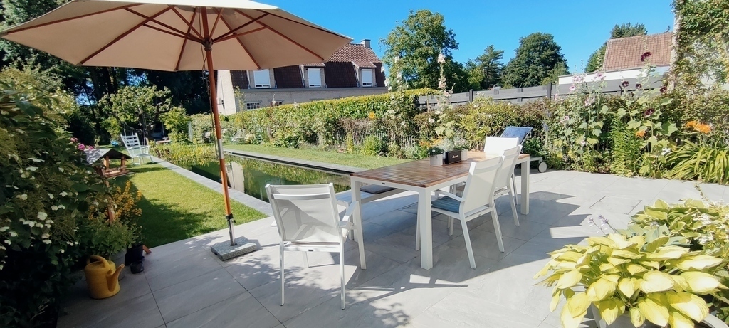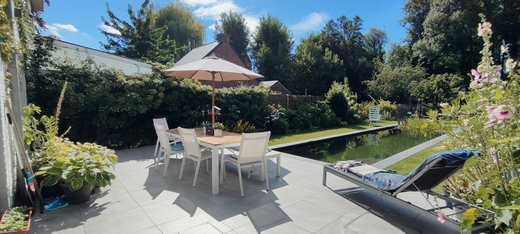 Een gerenoveerde woning met ruime tuin en zwemvijver aan de rand van Gent.