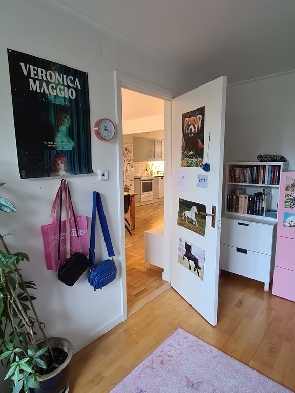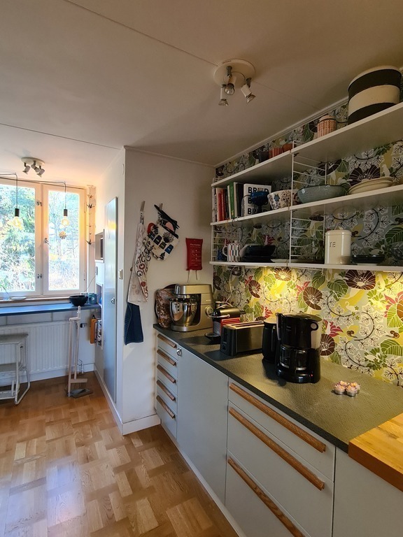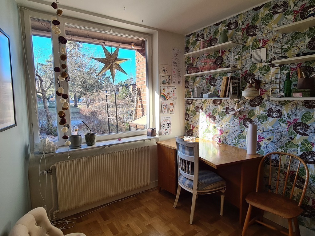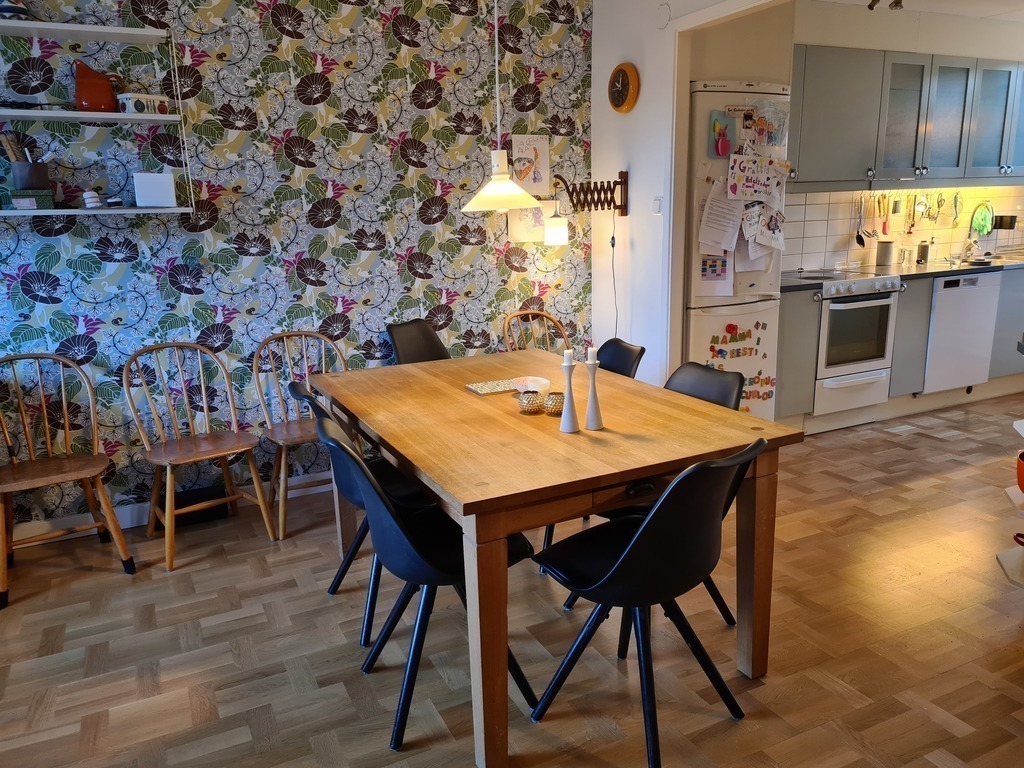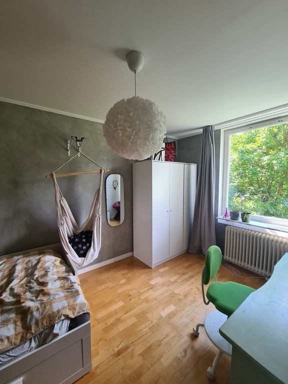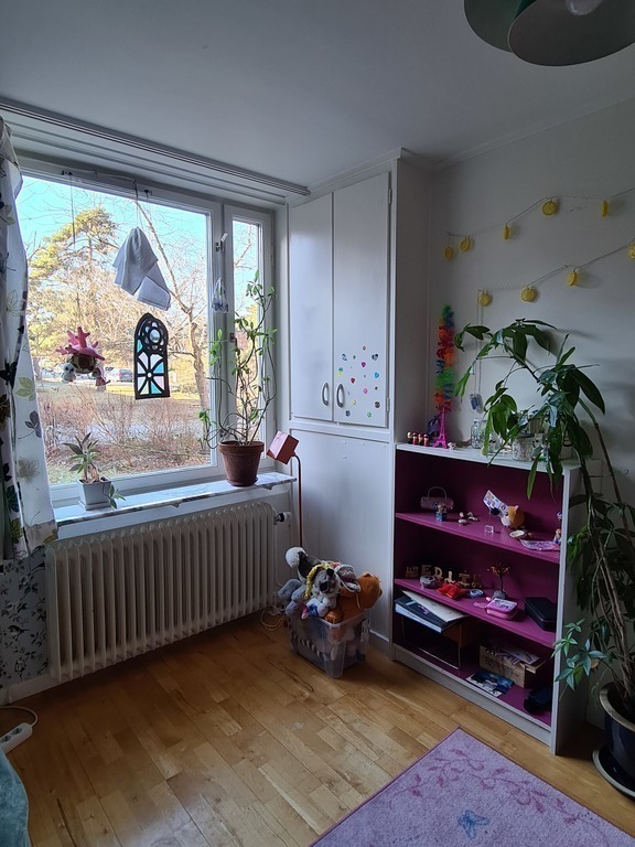 Our house is a row house built in the 1950s and designed by famous architect Leonie Geisendorf. The house is located in a green and quiet area close to Stockholm city center. It is at the end of the shortest subway line (15 minutes from Stockholm city center) and next to a large green recreational area where you can find lakes for swimming and trails for hiking or biking. The neighbourhood is small scale and cosy and great for children.