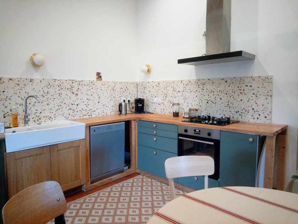 Elle est composée de 4 chambres (2 lits-doubles et deux lits simples d'enfant), une salle de bain, un espace salon//salle à manger/cuisine avec poêle à bois pour les soirées fraîches.