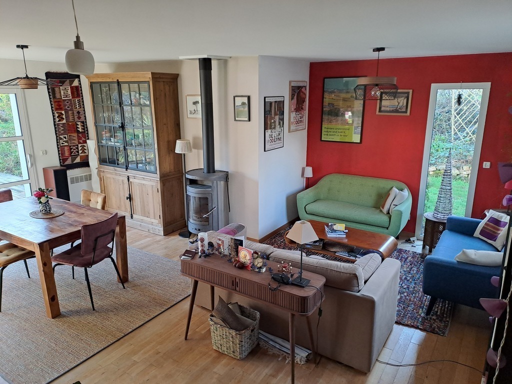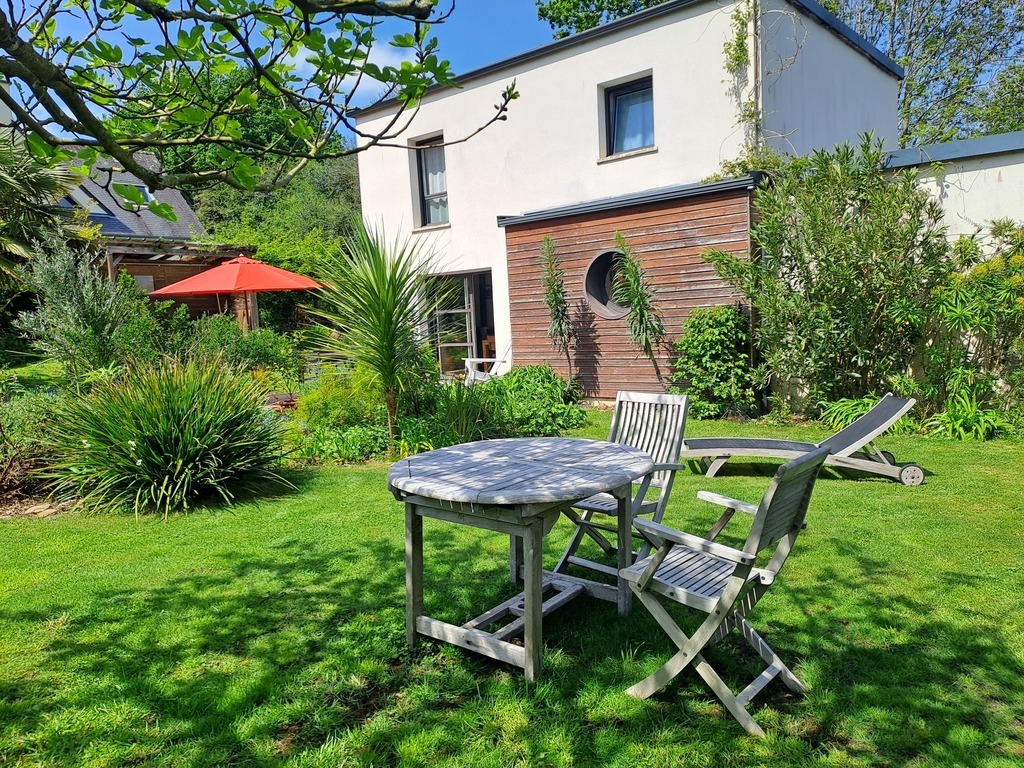 We propose a house with its garden 10 minutes from the Atlantic beaches and 15 minutes from the city of Quimper, in Brittany, an original region with a strong cultural identity. The house is not very big but is perfectly suitable for one, two or three people. It has a south-facing terrace, a bedroom downstairs with a bathroom, two bedrooms upstairs with a bathroom and an office.