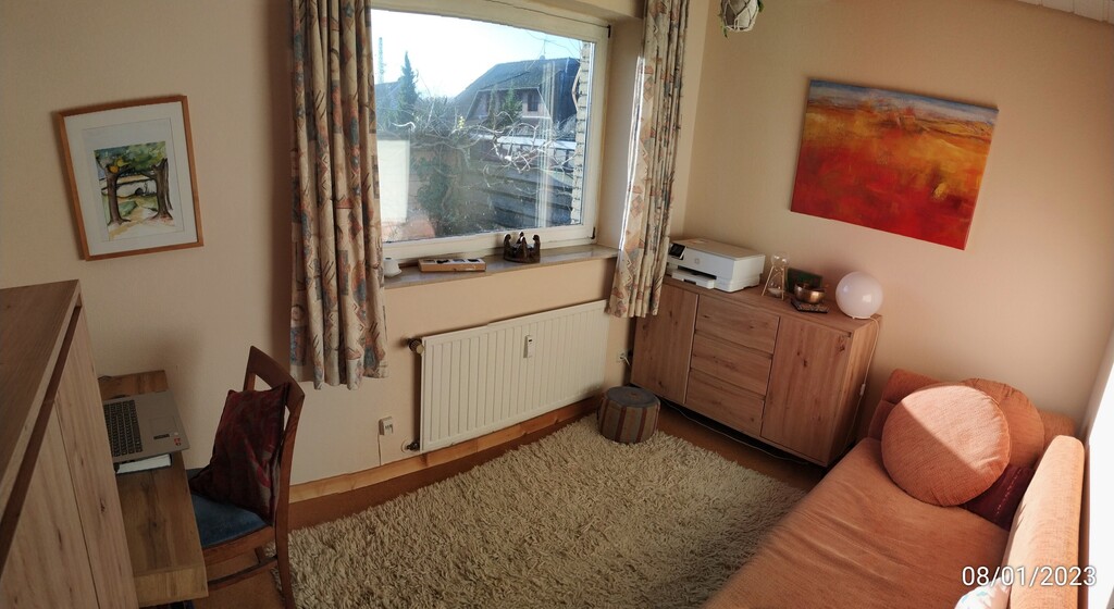 We live in the ground floor of a two family house. In our flat is space for 2-4 persons. The second sleeping-room is very small, when the sofa-bed is build up, and therefore only suitable for sleeping. There is more space in a caravan in the garden, what could be very nice in summer time to stay in.