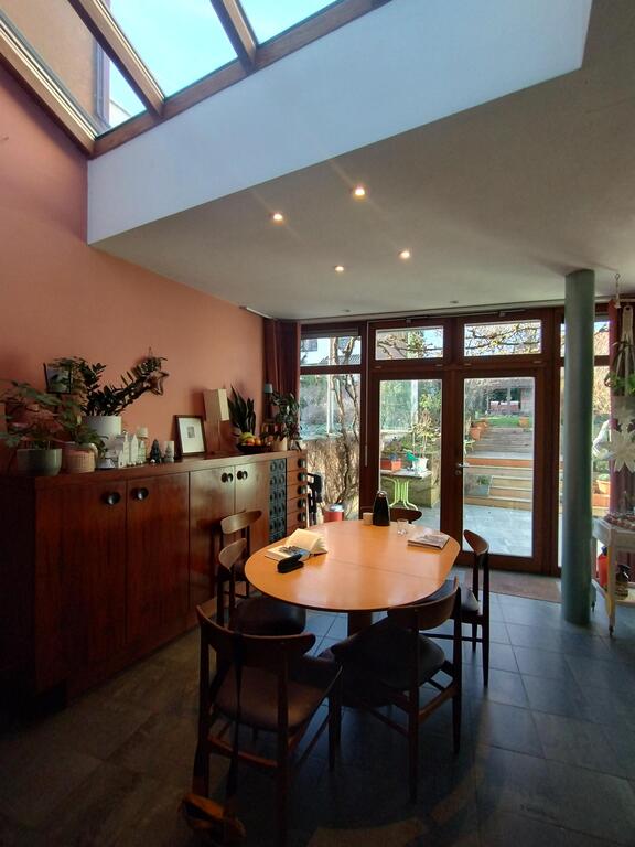 The house is built in 1936. Although it is a house in the row, it has some rural atmosphere with the terrace and the garden (with a little pond and beehives). The house has three floors: