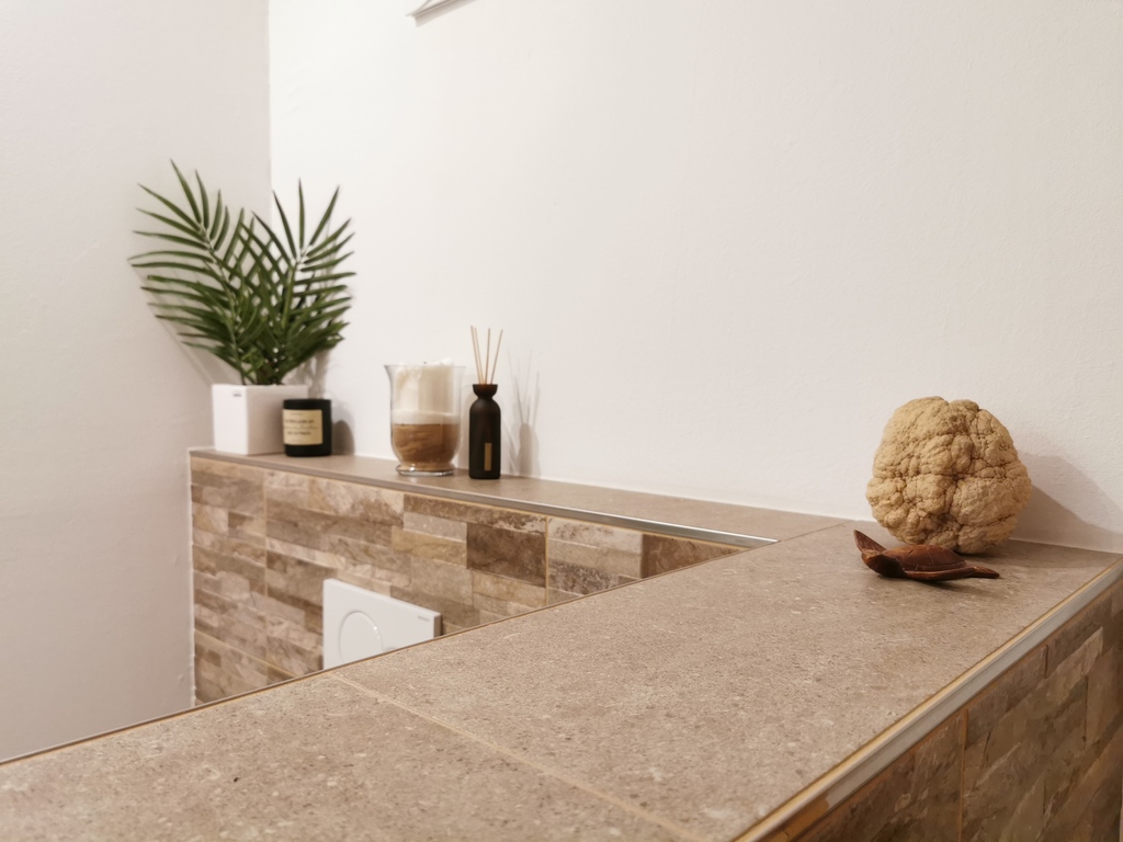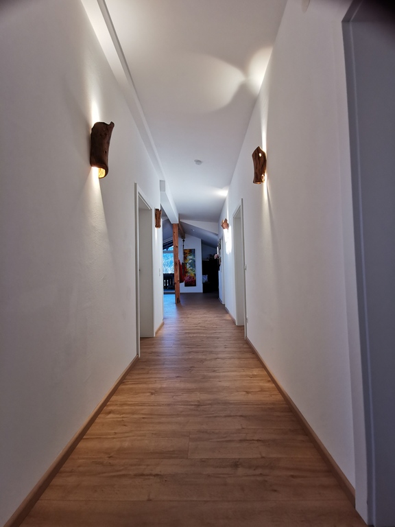 Unsere charmante und gemütliche Dachgeschosswohnung ist über eine Außenstiege erreichbar und wurde im Jahr 2017 komplett neu ausgebaut. Sie befindet sich im ersten Stock (Dachgeschoss) eines Hauses und verfügt über einen großen eigenen Garten. Der Wohnbereich ist offen gestaltet. Von diesem gelangt man direkt auf die gut geschützte Loggia mit Blick in das Grüne. Mit etwas Glück und je nach Jahreszeit können hier früh morgens Störche, Rehe und Hasen am Feld beobachtet werden. Eine Küche mit offenem Wohn-Essbereich und Kamin, zwei Schlafzimmer, ein großes Badezimmer mit Badewanne, Dusche und WC sowie ein separates Gäste WC stehen zur freien Benutzung zur Verfügung. Von der Wohnung aus können schöne Spaziergänge und Wanderungen unternommen werden.